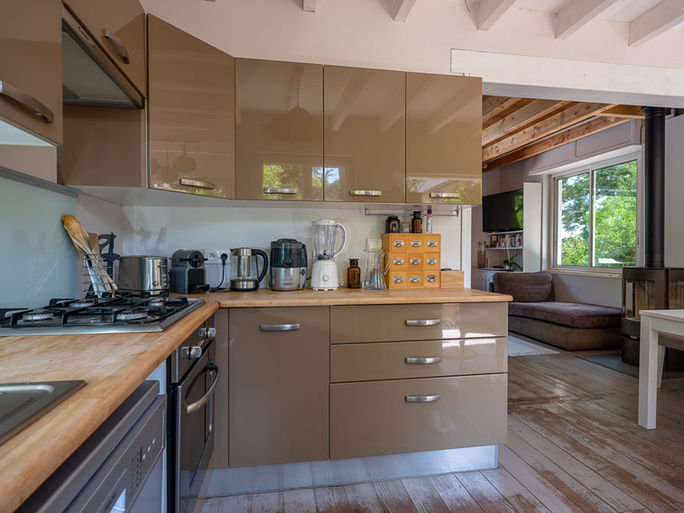 Un grand salon et cuisine confortablement équipés et le grand plus un poêle à bois pour vos soirées d’hiver.